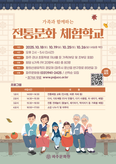가족이 함께 전통의 가치를 배우고 즐기는 ‘2025 가족과 함께하는 전통문화 체험학교’가 오는 10월 18일(토)부터 26일(일)까지 황희선생유적지(파주시 문산읍 반구정로 85번길 3)에서 열린다. 이번 행사는 전통 예절과 다도, 전래놀이 등 온 가족이 함께 체험할 수 있는 프로그램으로 구성됐다.