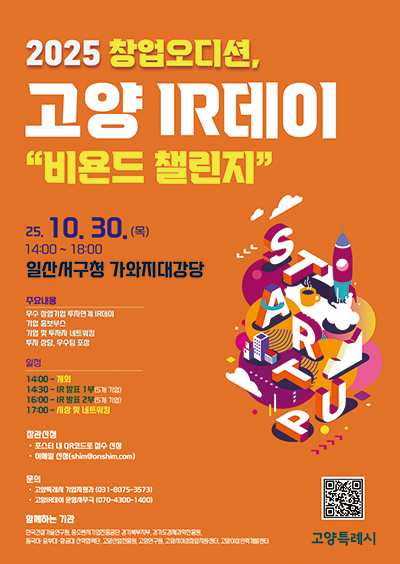 고양특례시는 오는 30일 일산서구청 가와지 대강당에서 창업오디션‘2025년 하반기 고양 아이알(IR)데이’를 개최한다고 밝혔다.