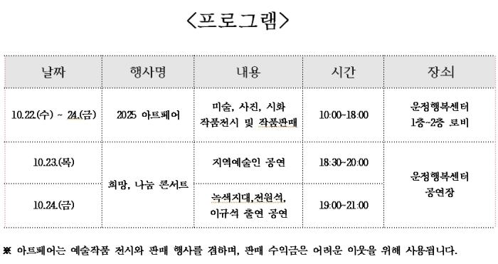2025 제6회 ‘희망, 나눔’ 파주 아트 페스티벌은 ‘희망과, 나눔’을 주제로 시민들에게 공연을 통해 ‘희망’과 ‘행복’을 전하며, 소외되고 어려운 환경에서 생활하는 이웃에게 아트페어 행사를 통해 발생한 수익금으로 ‘나눔’을 전달하는 온정의 시간을 만들고자한다. 10월 22일(수) 오전 10시부터 운정행복센터 1~2층 로비에서 미술·사진·시화작품을 감상할 수 있는 아트페어 행사가 진행되며 23일 (목) ~ 24일 (금) 희망, 나눔 콘서트가 진행된다. 아트페어는 22일 (수) ~ 24일 (금) 오전 10시~ 오후 6시까지 미술, 사진, 시화작품 전시 및 판매가 3일간 진행된다.