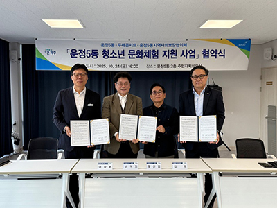 파주시 운정5동은 지난 24일, ‘청소년 문화체험 지원사업’의 원활한 추진을 위해 ‘두레콘서트’ 및 운정5동지역사회보장협의체와 함께 업무협약을 체결했다고 밝혔다.