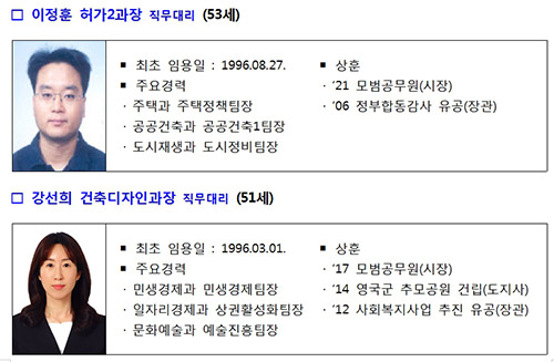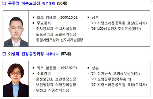 또한 ▲복지지원과장에 김영희 문화정책팀장, ▲허가총괄과장에 배준우 도로관리3팀장, ▲허가2과장에 이정훈 주택정책팀장, ▲건축디자인과장에 강선희 민생경제팀장, ▲하수도과장에 윤주영 주차시설팀장, ▲건강증진과장에 여상미 보건행정팀장, ▲기술보급과장에 김성근 농업교육팀장이 각각 사무관 승진 임용되어 새로운 보직을 부여받았다.