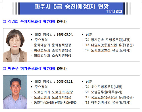 파주시는 이번 인사를 통해 민선8기 동안 추진해 온 민생·복지·안전·도시성장·문화관광 등 시정 전반의 과제들을 체계적으로 마무리하는 한편, 민생경제국 보직 부여를 계기로 지역경제와 시민 생활과 직결된 현안에도 더욱 세심하게 대응해 나갈 계획이다.