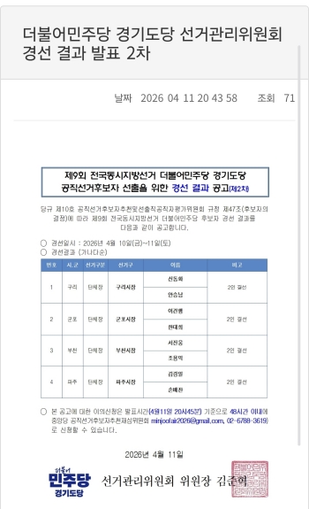 더불어민주당 파주시장 후보 선출을 위한 1차 경선 결과, 과반득표자가 없어 김경일 현 시장과 손배찬 전 시의회 의장이 공천권을 놓고 결선 투표를 하게 됐다.