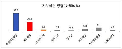 박용호 후보는 29.0%로 나타났으며, 같은 조사에서 국민의힘 정당 지지율은 26.1%로 집계되었다. 이재홍 후보는 5.1%로 나타났다.