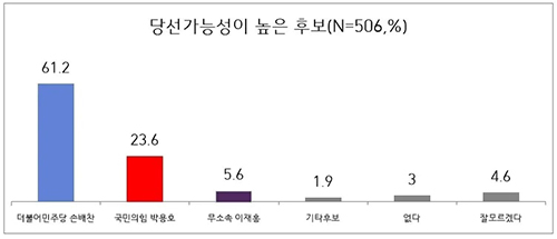 특히 같은 조사에서 더불어민주당 정당 지지율이 51.1%로 나타난 가운데, 손 후보 지지율은 이보다 0.6%p 높게 나타났다.